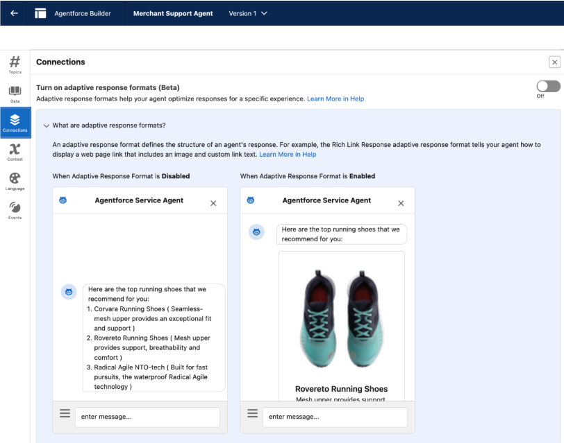 Enriched Responses with Agentforce Connections Agentforce now supports Agent Connections, enabling adaptive, context-rich responses like rich links (titles with thumbnails) tailored to each channel or interface.