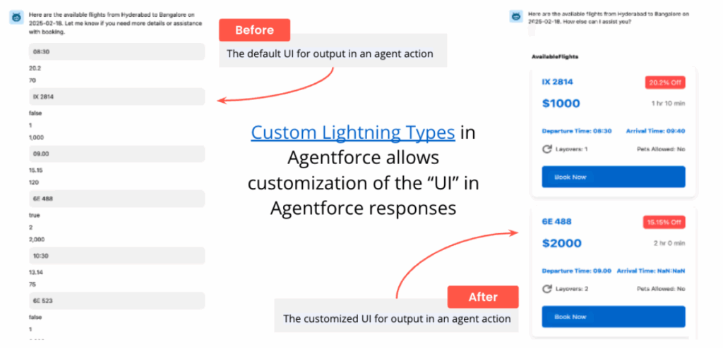 Custom Lightning TypesWith Custom Lightning Types, developers can define how Agentforce responses are rendered in the UI, using Lightning Web Components for custom formats like carousels, rich cards, or multi-step prompts.