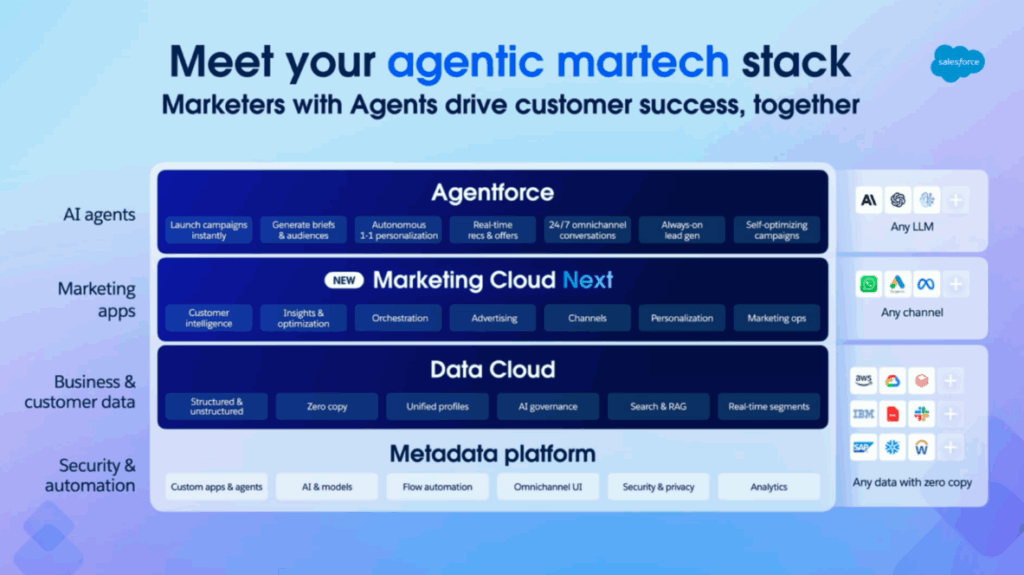 Salesforce’s Connections ’25 spotlighted Marketing Cloud Next, a roadmap emphasizing AI-first strategy, seamless data flow with Data Cloud, and deeper core platform consolidation integration. We expect Agentforce-wired campaign creation, enhanced AI content tools, and unified cross-cloud journeys to roll out later this year. There’s a clear push to make marketing automation more autonomous, intelligence-driven, and accessible across teams.